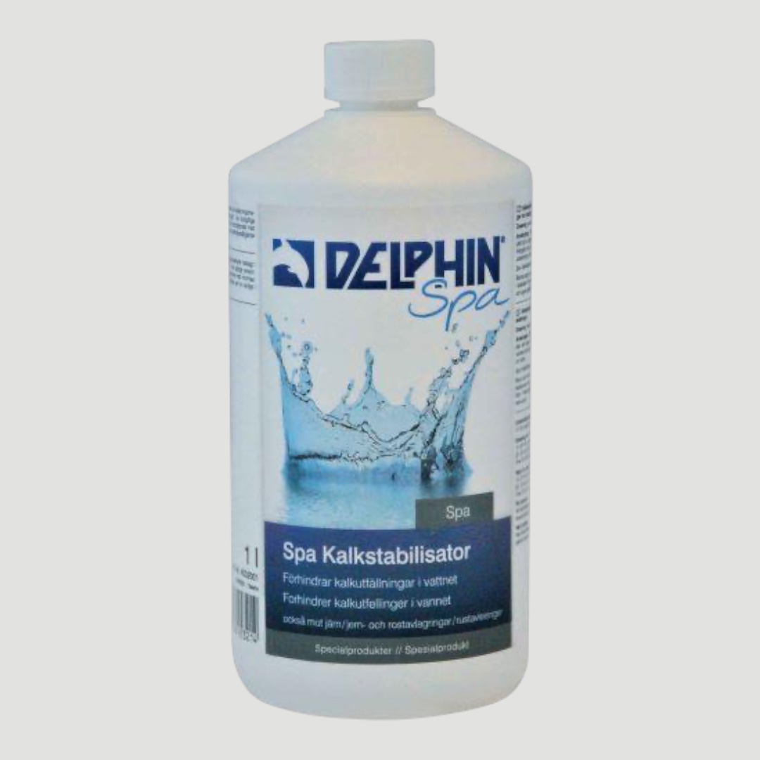 Delphin Spa Kalkstabilisaattori on nestemäinen vedenhoitotuote, joka alentaa veden kovuutta ja ehkäisee tehokkaasti kalkkisaostumien ja kerrostumien muodostumista ulkoporealtaassa.